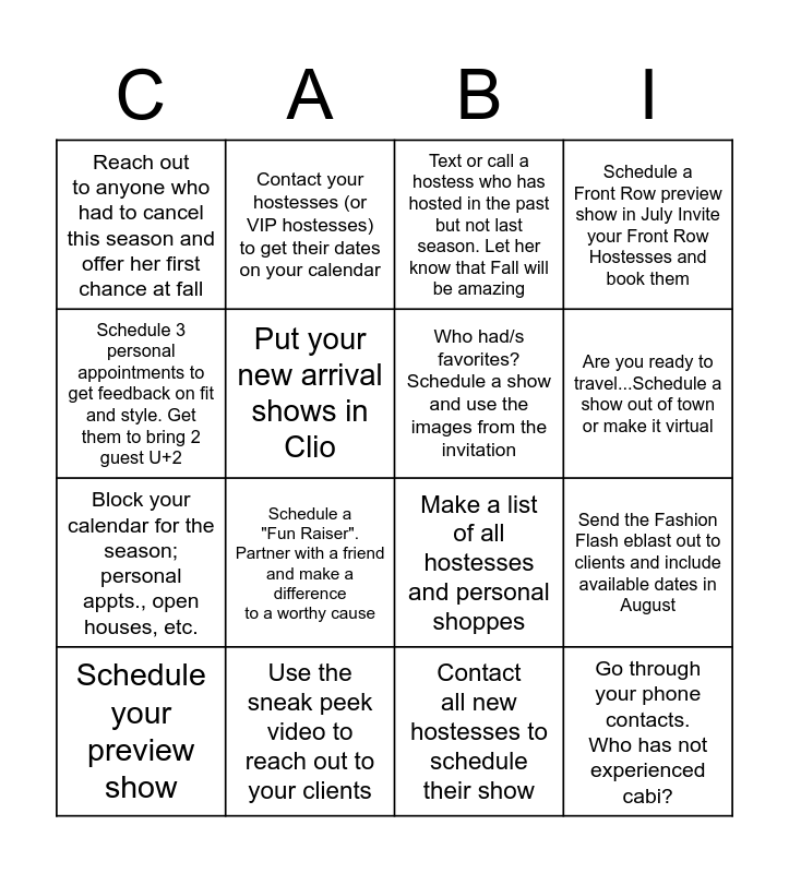 This bingo card has 16 words: Use the sneak peek video to reach out to your clients, Send the Fashion Flash eblast out to clients and include available dates in August, Text or call a hostess who has hosted in the past but not last season. Let her know that Fall will be amazing, Reach out to anyone who had to cancel this season and offer her first chance at fall, Block your calendar for the season; personal appts., open houses, etc., Contact your hostesses (or VIP hostesses) to get their dates on your calendar, Make a list of all hostesses and personal shoppes, Contact all new hostesses to schedule their show, Schedule 3 personal appointments to get feedback on fit and style. Get them to bring 2 guest U+2, Put your new arrival shows in Clio, Schedule your preview show, Schedule a Front Row preview show in July Invite your Front Row Hostesses and book them, Schedule a "Fun Raiser". Partner with a friend and make a difference to a worthy cause, Are you ready to travel...Schedule a show out of town or make it virtual, Who had/s favorites? Schedule a show and use the images from the invitation and Go through your phone contacts. Who has not experienced cabi?.