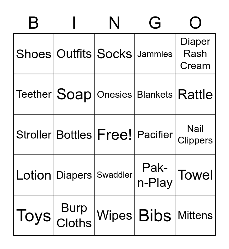 This bingo card has a free space and 24 words: Diapers, Burp Cloths, Onesies, Toys, Diaper Rash Cream, Shoes, Teether, Outfits, Pacifier, Swaddler, Blankets, Stroller, Pak-n-Play, Towel, Soap, Bibs, Nail Clippers, Socks, Rattle, Bottles, Mittens, Lotion, Jammies and Wipes.