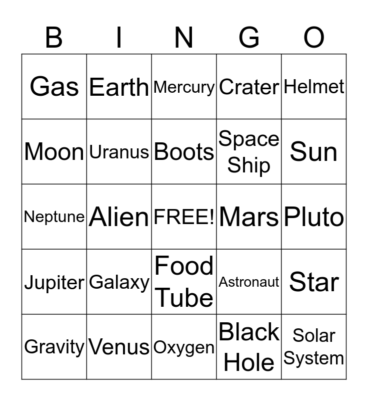 This bingo card has a free space and 24 words: Galaxy, Venus, Boots, Gravity, Helmet, Gas, Moon, Earth, Mars, Food Tube, Space Ship, Neptune, Astronaut, Star, Uranus, Black Hole, Pluto, Mercury, Sun, Alien, Solar System, Jupiter, Crater and Oxygen.