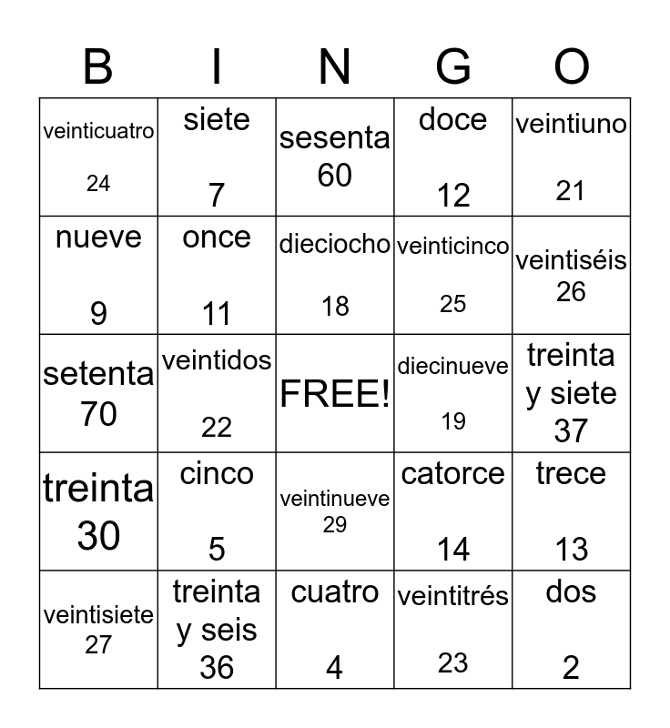 This bingo card has a free space and 46 words: uno 1, dos 2, tres 3, cuatro 4, cinco 5, Seis 6, siete 7, ocho 8, nueve 9, diez 10, once 11, doce 12, trece 13, catorce 14, dieciséis 16, diecisiete 17, dieciocho 18, diecinueve 19, veinte 20, veintiuno 21, veintidos 22, veintitrés 23, veinticuatro 24, veinticinco 25, veinticinco 25, veintiséis 26, veintisiete 27, veintiocho 28, veintinueve 29, treinta 30, treinta y uno 31, treinta y dos 32, treinta y tres 33, treinta y cuatro 34, treinta y cinco 35, treinta y seis 36, treinta y siete 37, treinta y ocho 38, treinta y nueve 39, cuarenta 40, cincuenta 50, sesenta 60, setenta 70, ochenta 80, noventa 90 and cien 100.
