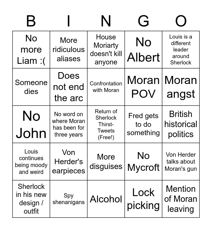 This bingo card has a free space and 24 words: Von Herder's earpieces, Spy shenanigans, Confrontation with Moran, Sherlock in his new design / outfit, Louis is a different leader around Sherlock, No more Liam :(, Someone dies, More ridiculous aliases, Fred gets to do something, More disguises, Moran POV, No John, No Mycroft, Von Herder talks about Moran's gun, Does not end the arc, Lock picking, British historical politics, House Moriarty doesn't kill anyone, Moran angst, No word on where Moran has been for three years, Mention of Moran leaving, Louis continues being moody and weird, No Albert and Alcohol.
