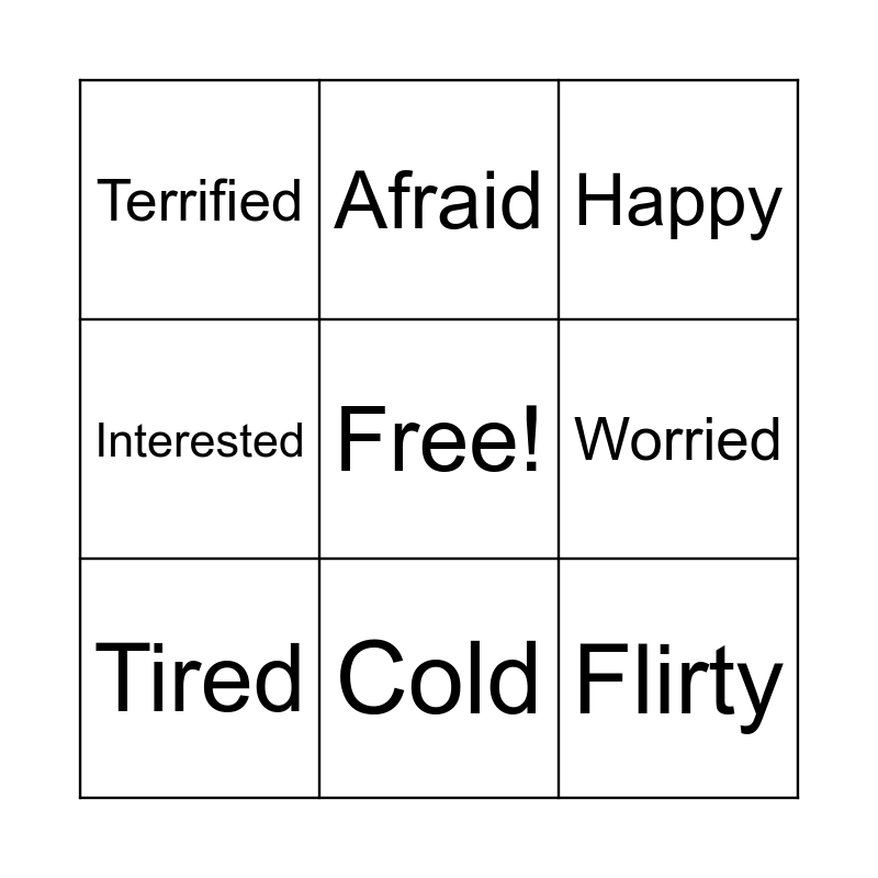 This bingo card has a free space and 12 words: Suprised, Robotic, Flirty, Worried, Afraid, Happy, Cold, Hesitant, Terrified, Interested, Tired and Sleepy.