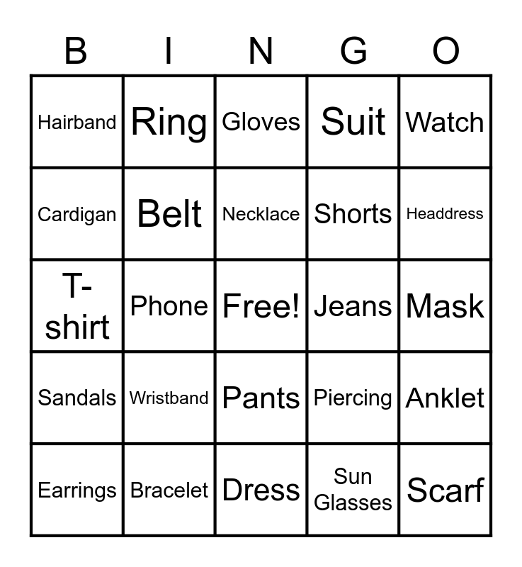This bingo card has a free space and 24 words: Wristband, Bracelet, Necklace, Earrings, Watch, Hairband, Cardigan, Ring, Jeans, Pants, Shorts, T-shirt, Piercing, Anklet, Belt, Sun Glasses, Mask, Gloves, Headdress, Phone, Scarf, Sandals, Suit and Dress.
