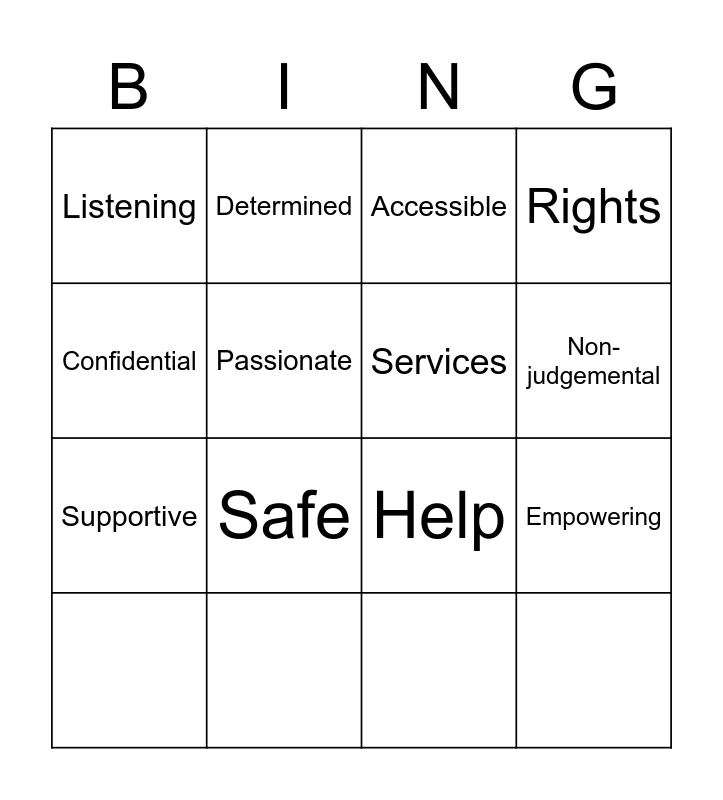 This bingo card has 12 words: Safe, Supportive, Confidential, Passionate, Determined, Accessible, Non-judgemental, Empowering, Listening, Rights, Services and Help.