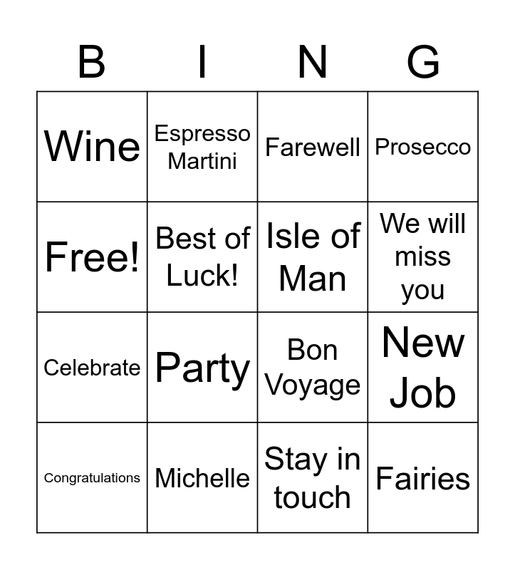 This bingo card has 16 words: Michelle, New Job, Farewell, Wine, Celebrate, Espresso Martini, Bon Voyage, Stay in touch, Free!, Best of Luck!, Congratulations, Prosecco, Party, We will miss you, Isle of Man and Fairies.
