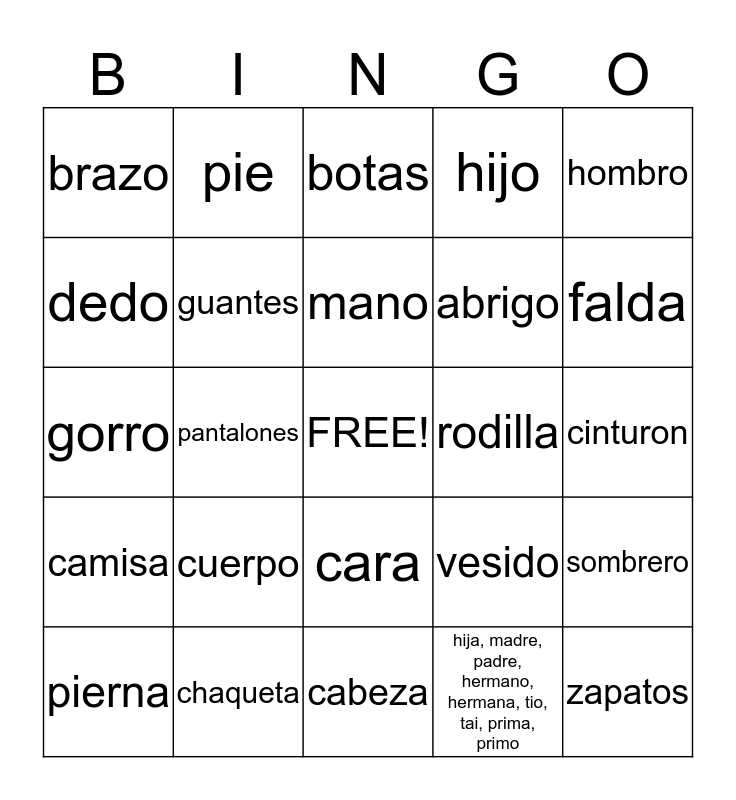 This bingo card has a free space and 25 words: cuerpo, cabeza, mano, pierna, hombro, brazo, dedo, pie, rodilla, cara, abrigo, gorro, vesido, sombrero, guantes, calcitines, cinturon, botas, falda, pantalones, zapatos, chaqueta, camisa, hijo and hija, madre, padre, hermano, hermana, tio, tai, prima, primo.