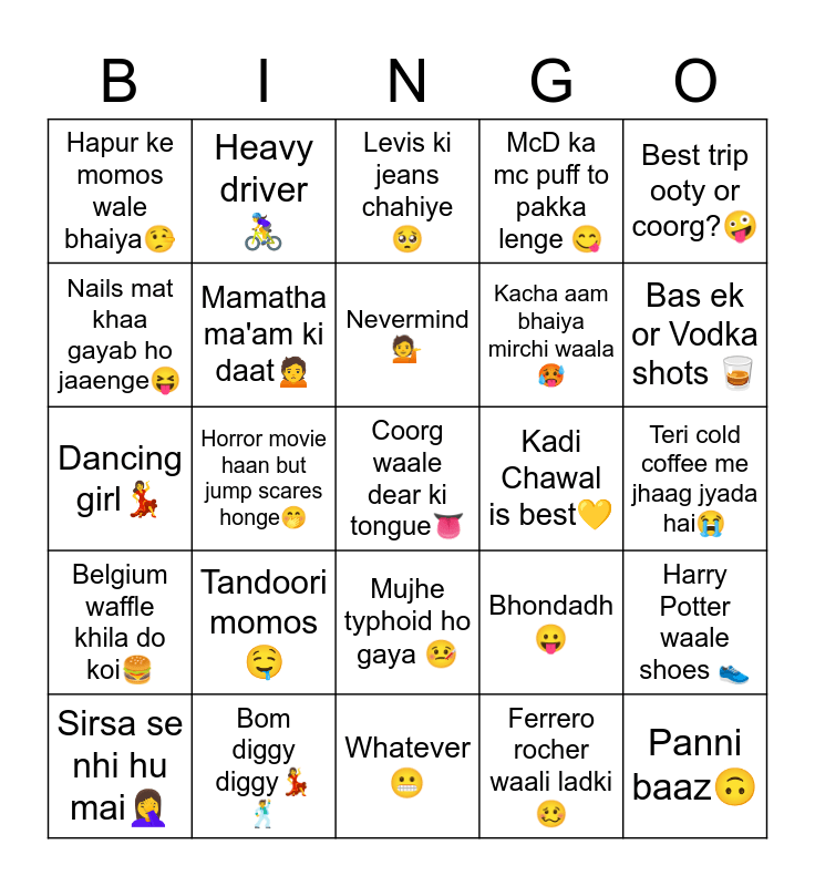 This bingo card has 25 words: Tandoori momos🤤, Whatever 😬, Nevermind 💁, Sirsa se nhi hu mai🤦♀️, Best trip ooty or coorg?🤪, Hapur ke momos wale bhaiya🤥, Nails mat khaa gayab ho jaaenge😝, Heavy driver 🚴♀️, Kadi Chawal is best💛, Mujhe typhoid ho gaya 🤒, Kacha aam bhaiya mirchi waala🥵, Dancing girl💃, Bhondadh😛, Harry Potter waale shoes 👟, Mamatha ma'am ki daat🙍, Panni baaz🙃, Teri cold coffee me jhaag jyada hai😭, Levis ki jeans chahiye 🥺, Bas ek or Vodka shots 🥃, Horror movie haan but jump scares honge🤭, Coorg waale dear ki tongue👅, Bom diggy diggy💃🕺, Belgium waffle khila do koi🍔, McD ka mc puff to pakka lenge 😋 and Ferrero rocher waali ladki🥴.