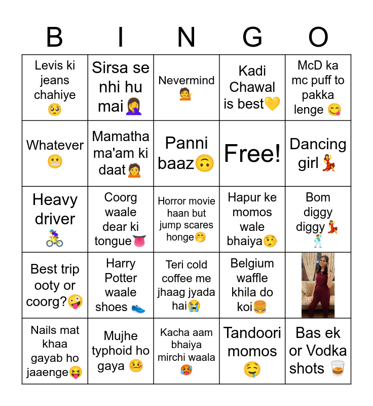 This bingo card has 2 images and 26 words: Free!, Tandoori momos🤤, Whatever 😬, Nevermind 💁, Sirsa se nhi hu mai🤦♀️, Best trip ooty or coorg?🤪, Hapur ke momos wale bhaiya🤥, Nails mat khaa gayab ho jaaenge😝, Heavy driver 🚴♀️, Kadi Chawal is best💛, Mujhe typhoid ho gaya 🤒, Kacha aam bhaiya mirchi waala🥵, Dancing girl💃, Bhondadh😛, Harry Potter waale shoes 👟, Mamatha ma'am ki daat🙍, Panni baaz🙃, Teri cold coffee me jhaag jyada hai😭, Levis ki jeans chahiye 🥺, Bas ek or Vodka shots 🥃, Horror movie haan but jump scares honge🤭, Coorg waale dear ki tongue👅, Bom diggy diggy💃🕺, Belgium waffle khila do koi🍔, McD ka mc puff to pakka lenge 😋 and Ferrero rocher waali ladki🥴.