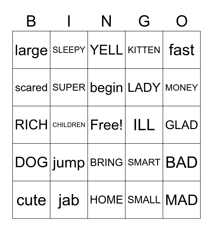 This bingo card has a free space and 24 words: jump, jab, begin, cute, fast, large, scared, SLEEPY, ILL, BRING, LADY, RICH, SMART, BAD, SUPER, SMALL, GLAD, YELL, MONEY, CHILDREN, MAD, DOG, KITTEN and HOME.