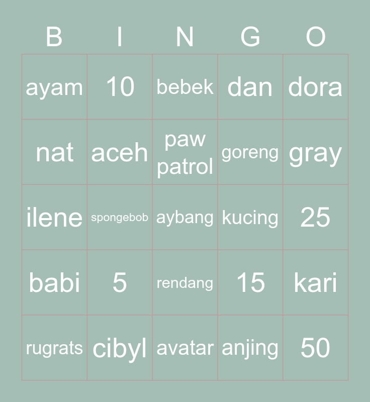 This bingo card has a free space and 24 words: 5, cibyl, paw patrol, rugrats, dora, ayam, nat, 10, kucing, rendang, goreng, ilene, 15, kari, aceh, anjing, 25, bebek, gray, spongebob, 50, babi, dan and avatar.