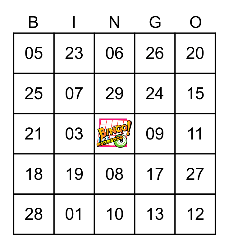 This bingo card has a free space and 30 words: 01, 02, 03, 04, 05, 06, 07, 08, 09, 10, 11, 12, 13, 14, 15, 16, 17, 18, 19, 20, 21, 22, 23, 24, 25, 26, 27, 28, 29 and 30.
