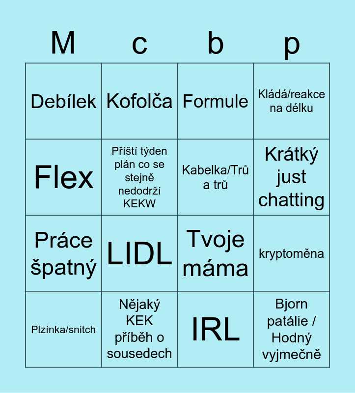 This bingo card has 16 words: Nějaký KEK příběh o sousedech, kryptoměna, Formule, Debílek, Práce špatný, Kofolča, Tvoje máma, IRL, Flex, Příští týden plán co se stejně nedodrží KEKW, Plzínka/snitch, Kládá/reakce na délku, LIDL, Krátký just chatting, Kabelka/Trů a trů and Bjorn patálie / Hodný vyjmečně.