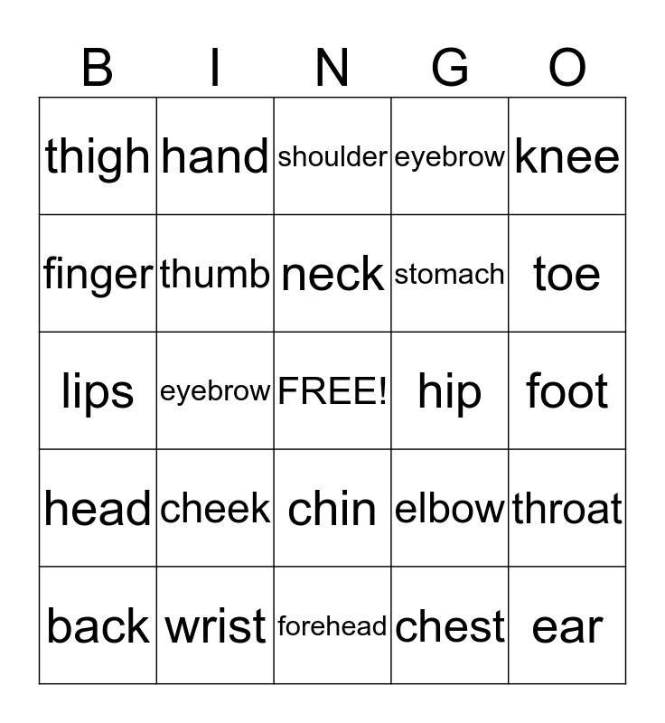 This bingo card has a free space and 24 words: cheek, wrist, neck, back, knee, thigh, finger, hand, hip, chin, stomach, lips, elbow, throat, thumb, chest, foot, shoulder, toe, eyebrow, ear, head, eyebrow and forehead.