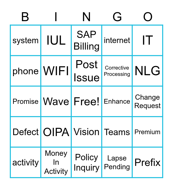 This bingo card has a free space and 24 words: activity, OIPA, Post Issue, Lapse Pending, IT, system, IUL, SAP Billing, Enhance, Change Request, Promise, WIFI, Teams, Premium, phone, Money In Activity, Policy Inquiry, internet, NLG, Defect, Wave, Vision, Corrective Processing and Prefix.