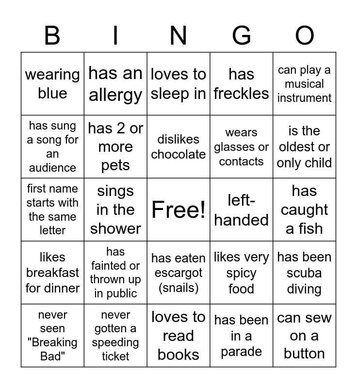 This bingo card has a free space and 41 words: been to a Hawaiian island, first name starts with the same letter, has had stitches, has 2 or more pets, never gotten a speeding ticket, has eaten escargot (snails), dislikes chocolate, has driven to Canada or Mexico, can play a musical instrument, likes breakfast for dinner, sings in the shower, has freckles, can sew on a button, has caught a fish, left-handed, has fainted or thrown up in public, has taken a train trip, wearing blue, enjoys cooking, loves to sleep in, has been scuba diving, cuts their own hair, loves to read books, wears glasses or contacts, wearing ClearStream logo, speaks a foreign language, has been in a parade, has seen the same movie 5+ times, is the oldest or only child, born in Utah, same birthday month, has an allergy, never seen "Breaking Bad", has lived in another state, likes very spicy food, has sung a song for an audience, has ever been on a boat, married over 10 years, been to a musical, played on a sports team and has done the water bottle flip successfully.