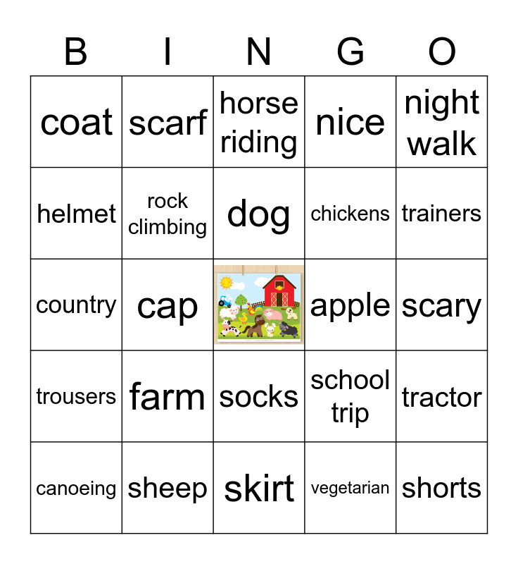 This bingo card has a free space and 24 words: farm, sheep, dog, canoeing, night walk, coat, helmet, scarf, apple, socks, chickens, country, school trip, tractor, rock climbing, vegetarian, scary, horse riding, trainers, cap, shorts, trousers, nice and skirt.