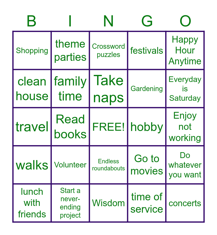 This bingo card has a free space and 29 words: Collect Social Security, Start a never-ending project, Crossword puzzles, Goodbye tension, Happy Hour Anytime, Shopping, family time, Take naps, hobby, Do whatever you want, lunch with friends, Read books, time of service, concerts, travel, mentor, Wisdom, Go to movies, Everyday is Saturday, walks, Volunteer, Sleep in, Gardening, Enjoy not working, clean house, theme parties, Endless roundabouts, festivals and Relax on beach.