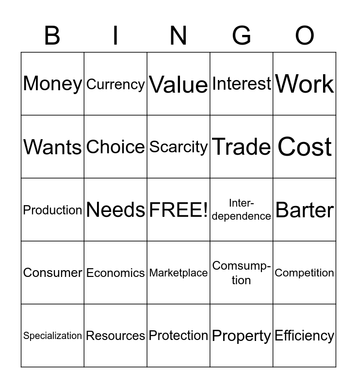 This bingo card has a free space and 24 words: Economics, Resources, Scarcity, Specialization, Work, Money, Wants, Currency, Inter- dependence, Marketplace, Trade, Production, Comsump-tion, Competition, Choice, Property, Barter, Value, Cost, Needs, Efficiency, Consumer, Interest and Protection.