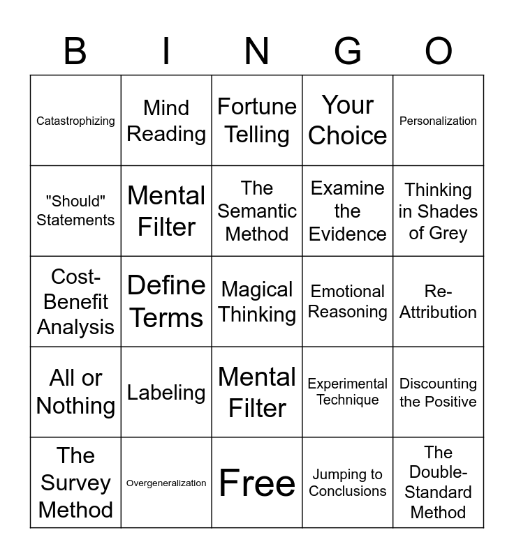 This bingo card has 25 words: All or Nothing, Overgeneralization, Magical Thinking, Jumping to Conclusions, Personalization, Catastrophizing, Mind Reading, Fortune Telling, Emotional Reasoning, Discounting the Positive, "Should" Statements, Mental Filter, Free, Experimental Technique, Thinking in Shades of Grey, The Survey Method, Define Terms, The Semantic Method, Examine the Evidence, Re-Attribution, Cost-Benefit Analysis, Labeling, Mental Filter, Your Choice and The Double-Standard Method.