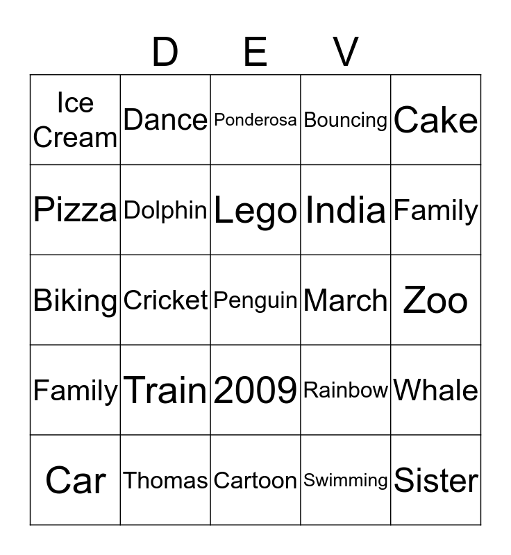 This bingo card has a free space and 24 words: Train, Thomas, Lego, Car, Cake, Ice Cream, Pizza, Dance, March, 2009, India, Biking, Rainbow, Whale, Dolphin, Swimming, Zoo, Ponderosa, Family, Cricket, Sister, Family, Bouncing and Cartoon.