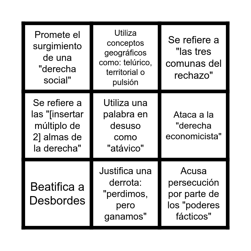 This bingo card has a free space and 8 words: Ataca a la "derecha economicista", Se refiere a "las tres comunas del rechazo", Utiliza conceptos geográficos como: telúrico, territorial o pulsión, Beatifica a Desbordes, Promete el surgimiento de una "derecha social", Acusa persecución por parte de los "poderes fácticos", Se refiere a las "[insertar múltiplo de 2] almas de la derecha" and Justifica una derrota: "perdimos, pero ganamos".