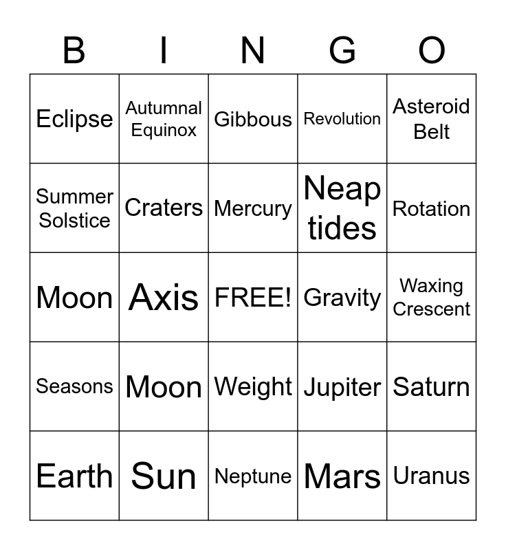 This bingo card has a free space and 24 words: Moon, Sun, Mercury, Earth, Asteroid Belt, Eclipse, Summer Solstice, Autumnal Equinox, Gravity, Weight, Neap tides, Moon, Jupiter, Saturn, Craters, Mars, Waxing Crescent, Gibbous, Rotation, Axis, Uranus, Seasons, Revolution and Neptune.