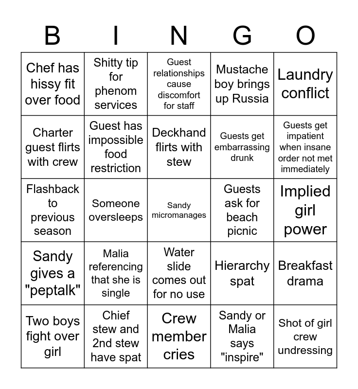 This bingo card has a free space and 24 words: Malia referencing that she is single, Chief stew and 2nd stew have spat, Deckhand flirts with stew, Two boys fight over girl, Laundry conflict, Chef has hissy fit over food, Charter guest flirts with crew, Shitty tip for phenom services, Guests ask for beach picnic, Water slide comes out for no use, Guests get embarrassing drunk, Flashback to previous season, Hierarchy spat, Breakfast drama, Guest has impossible food restriction, Sandy or Malia says "inspire", Implied girl power, Guest relationships cause discomfort for staff, Guests get impatient when insane order not met immediately, Someone oversleeps, Shot of girl crew undressing, Sandy gives a "peptalk", Mustache boy brings up Russia and Crew member cries.