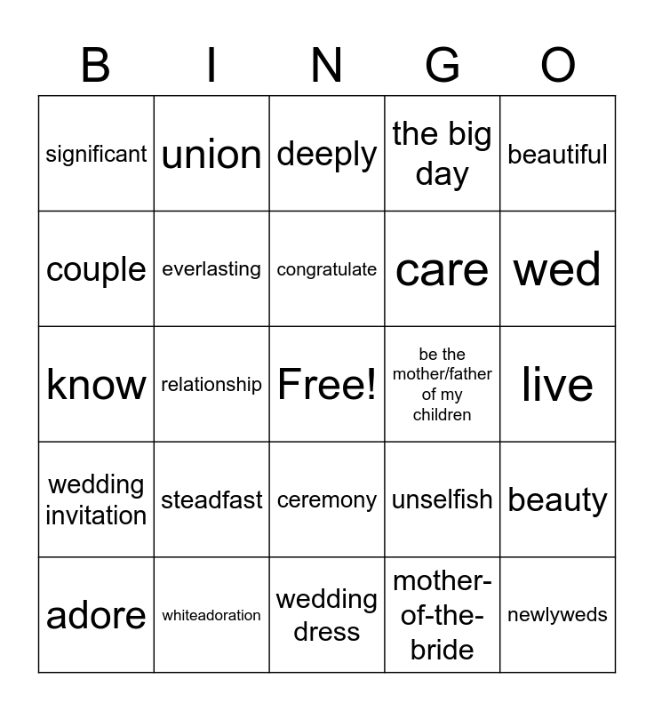 This bingo card has a free space and 222 words: adoring, always, beautiful, blessed, blushing, caring, committed, dedicated, deep, deeply, devoted, devotedly, distinctive, elegant, lovable, love-struck, loving, lovingly, lucky, newlywed, once-in-a-lifetime, only, passionate, perfect, precious, private, profound, romantic, everlasting, exciting, faithful, fond, fondly, forever, future, handsome, happy, heartfelt, inexpressible, innermost, inspirational, intimate, significant, sophisticated, special, steadfast, sweet, together, touching, treasured, undying, unselfish, upcoming, wedded, wedding, whiteadoration, affection, beauty, beloved, best friend, bond, bridal party, bride, bride-to-be, bridezilla, caress, celebration, ceremony, church, commitment, confidante, congratulations, couple, darling, devotion, diamond, marriage, mate, matrimony, memories, milestone, mother-of-the-bride, my other, newlywed, newlyweds, nuptials, oath, partner, passion, pearls, personality, pledge, promise, proposal, reception, registry, relationship, engagement, engagement ring, fate, feelings, flower girl, forever, future, gown, groom, happiness, heart, honeymoon, husband, inspiration, intimacy, journey, joy, kisses, life, lifetime, love, romance, soul mate, spouse, sweetheart, team, the big day, toast, train, understanding, union, veil, vows, wedding bells, wedding dress, wedding gift, wedding gown, wedding invitation, wedding party, wedlock, wife, wishacknowledge, admire, adore, announce, appreciate, ask, attend, be the mother/father of my children, become one, begin, betroth, blush, care, caress, celebrate, cherish, commemorate, commit, complement, complete, congratulate, honeymoon, honor, inspire, join, kiss, know, listen to, live, love, love each other, marry, memorialize, offer, pledge, promise, propose, protect, provide, respect, romance, safeguard, convey, declare, desire, devote, engage, enrich, entrust, espouse, exchange, experience, express, feel, fill with, friend, gather, get hitched, get married, give away the bride, give in marriage, help, hold, say "I do", seduce, set forth, share, shield, shower with love, soar, start, take on oath, thank, toast, touch, treasure, trust, understand, unite, uphold, value, walk through life, wed and worship.