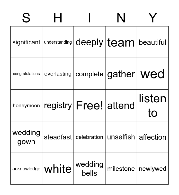 This bingo card has a free space and 224 words: adoring, always, beautiful, blessed, blushing, caring, committed, dedicated, deep, deeply, devoted, devotedly, distinctive, elegant, lovable, love-struck, loving, lovingly, lucky, newlywed, once-in-a-lifetime, only, passionate, perfect, precious, private, profound, romantic, everlasting, exciting, faithful, fond, fondly, forever, future, handsome, happy, heartfelt, inexpressible, innermost, inspirational, intimate, significant, sophisticated, special, steadfast, sweet, together, touching, treasured, undying, unselfish, upcoming, wedded, wedding, white, adoration, affection, beauty, beloved, best friend, bond, bridal party, bride, bride-to-be, bridezilla, caress, celebration, ceremony, church, commitment, confidante, congratulations, couple, darling, devotion, diamond, marriage, mate, matrimony, memories, milestone, mother-of-the-bride, my other, newlywed, newlyweds, nuptials, oath, partner, passion, pearls, personality, pledge, promise, proposal, reception, registry, relationship, engagement, engagement ring, fate, feelings, flower girl, forever, future, gown, groom, happiness, heart, honeymoon, husband, inspiration, intimacy, journey, joy, kisses, life, lifetime, love, romance, soul mate, spouse, sweetheart, team, the big day, toast, train, understanding, union, veil, vows, wedding bells, wedding dress, wedding gift, wedding gown, wedding invitation, wedding party, wedlock, wife, wish, acknowledge, admire, adore, announce, appreciate, ask, attend, be the mother/father of my children, become one, begin, betroth, blush, care, caress, celebrate, cherish, commemorate, commit, complement, complete, congratulate, honeymoon, honor, inspire, join, kiss, know, listen to, live, love, love each other, marry, memorialize, offer, pledge, promise, propose, protect, provide, respect, romance, safeguard, convey, declare, desire, devote, engage, enrich, entrust, espouse, exchange, experience, express, feel, fill with, friend, gather, get hitched, get married, give away the bride, give in marriage, help, hold, say "I do", seduce, set forth, share, shield, shower with love, soar, start, take on oath, thank, toast, touch, treasure, trust, understand, unite, uphold, value, walk through life, wed and worship.