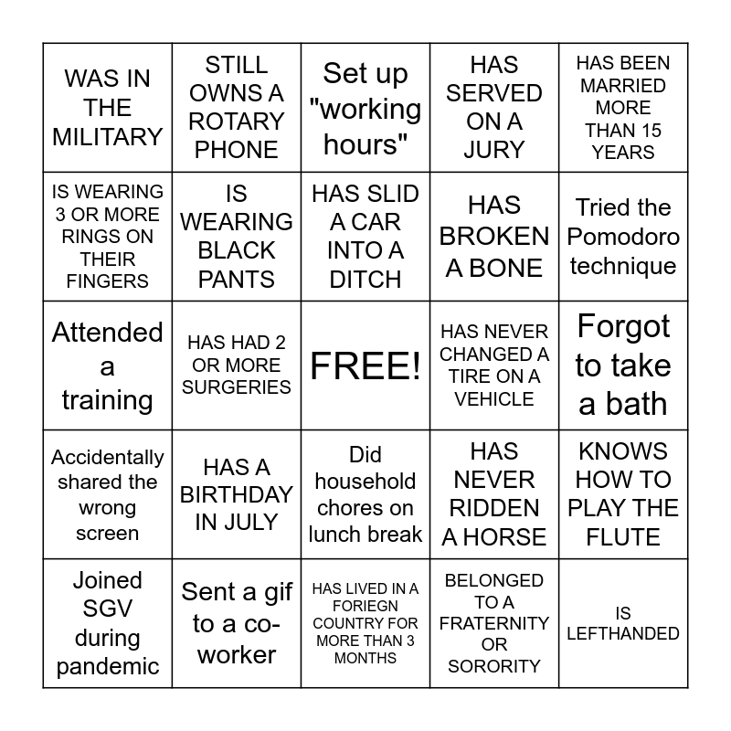 This bingo card has a free space and 50 words: GRADUATED FROM PLENTYWOOD HIGH SCHOOL, IS LEFTHANDED, HAS BEEN SKYDIVING, HAS LIVED IN A FORIEGN COUNTRY FOR MORE THAN 3 MONTHS, HAS A BIRTHDAY IN JULY, HAS BEEN TO ONE OR MORE OF THE GREAT LAKES, STILL OWNS A ROTARY PHONE, HAS TAKEN KARATE CLASS, IS WEARING 3 OR MORE RINGS ON THEIR FINGERS, IS A NOTARY PUBLIC, IS WEARING BLACK PANTS, HAS SERVED ON A JURY, KNOWS HOW TO PLAY THE FLUTE, HAS NEVER RIDDEN A HORSE, LIVES IN A YELLOW HOUSE, HAS AN INDOOR PET THAT ISN'T A CAT OR DOG, HAS SLID A CAR INTO A DITCH, HAS NEVER CHANGED A TIRE ON A VEHICLE, WEARS CONTACTS, HAS BEEN MARRIED MORE THAN 15 YEARS, HAS HAD 2 OR MORE SURGERIES, BELONGED TO A FRATERNITY OR SORORITY, WAS IN THE MILITARY, HAS BROKEN A BONE, Talking while on mute, Created a makeshift "standing desk", Tried the Pomodoro technique, Created a workday playlist, Set up "working hours", Did household chores on lunch break, Wore pajama bottoms to a video meeting, Drank 3 cups of coffee/tea, Used an emoji in an email, Worked from back yard, porch, or balcony, Sent a gif to a co-worker, Did some stretching after call, Bought an ergonomic chair, "Can everyone see my screen?", Drank 2 liters of water, Forgot to take a bath, Made a really good breakfast, Chatted with a colleague to see how they are, Contacted IT team for repair, Finished a WBL, Joined SGV during pandemic, Attended a training, Forgot the attachment while sending an email, Got a haircut during quarantine, Accidentally shared the wrong screen and Forgot to mute.