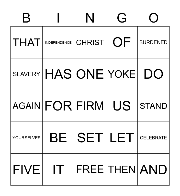 This bingo card has 30 words: IT, IS, FOR, FREEDOM, THAT, CHRIST, HAS, SET, US, FREE, STAND, FIRM, THEN, AND, DO, NOT, LET, YOURSELVES, BE, BURDENED, AGAIN, BY, INDEPENDENCE, YOKE, SLAVERY, OF, CELEBRATE, FIVE, ONE and JULY.