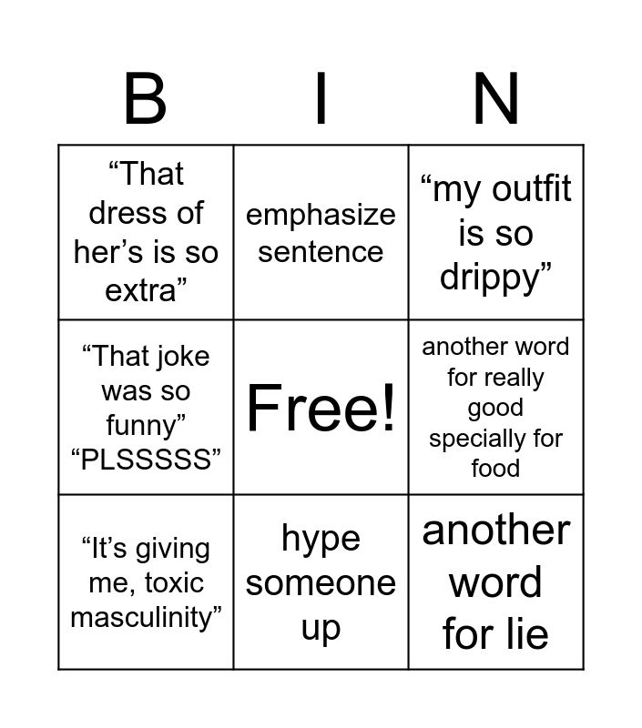 This bingo card has a free space and 12 words: “That guy looks real sus”, ON GOD, another word for lie, another word for really good specially for food, emphasize sentence, “my outfit is so drippy”, hype someone up, another word for yes, “That dress of her’s is so extra”, “That joke was so funny” “PLSSSSS”, “It’s giving me, toxic masculinity” and You can use it when you want to say something subtly.