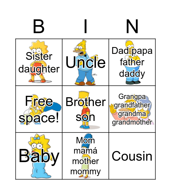 This bingo card has 9 images and 10 words: Mom mamá mother mommy, Dad papa father daddy, Sister daughter, Brother son, Free space!, Baby, Uncle, Aunt, Grangpa grandfather grandma grandmother and Cousin.