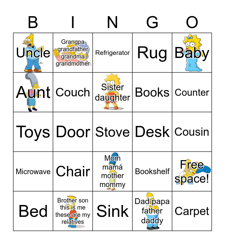 This bingo card has 9 images and 26 words: Mom mamá mother mommy, Dad papa father daddy, Sister daughter, Brother son this is me these are my relatives, Baby, Uncle, Aunt, Grangpa grandfather grandma grandmother, Cousin, Bookshelf, Books, Toys, Free space!, Bed, Door, Window, Rug, Microwave, Refrigerator, Stove, Counter, Sink, Desk, Chair, Couch and Carpet.