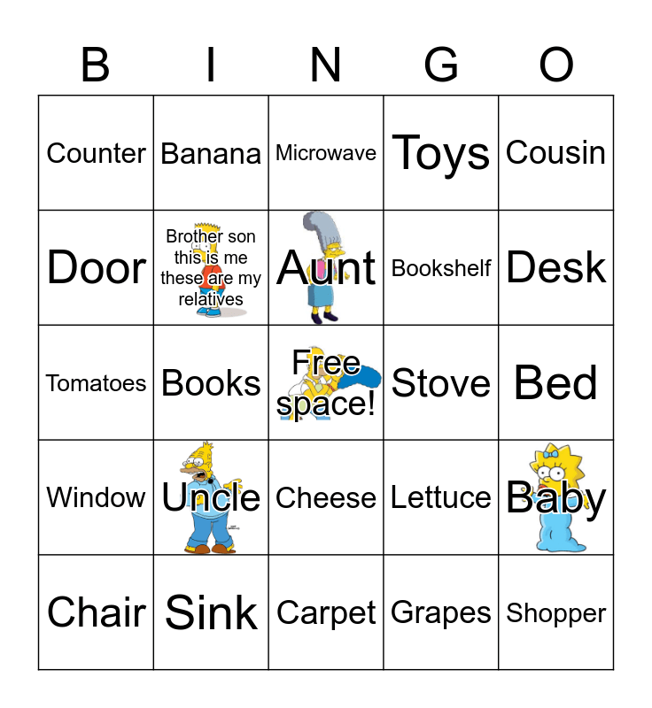 This bingo card has 9 images and 38 words: Mom mamá mother mommy, Dad papa father daddy, Sister daughter, Brother son this is me these are my relatives, Baby, Uncle, Aunt, Grangpa grandfather grandma grandmother, Cousin, Bookshelf, Books, Toys, Free space!, Bed, Door, Window, Rug, Microwave, Refrigerator, Stove, Counter, Sink, Desk, Chair, Couch, Carpet, Shopper, Cart, Groceries, Meat, Milk, Cheese, Grapes, Banana, Apple, Lettuce, Tomatoes and Carrots.