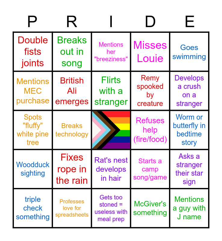 This bingo card has a free space and 24 words: Fixes rope in the rain, Professes love for spreadsheets, Flirts with a stranger, triple check something, Goes swimming, Double fists joints, Mentions MEC purchase, Breaks out in song, Refuses help (fire/food), Rat's nest develops in hair, Remy spooked by creature, Spots "fluffy" white pine tree, Starts a camp song/game, Asks a stranger their star sign, British Ali emerges, McGiver's something, Worm or butterfly in bedtime story, Mentions her "breeziness", Develops a crush on a stranger, Breaks technology, Mentions a guy with J name, Woodduck sighting, Misses Louie and Gets too stoned = useless with meal prep.