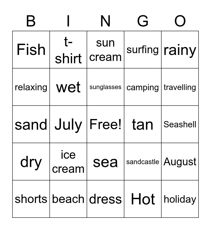This bingo card has a free space and 34 words: Sunny, Hot, cold, sweaty, dry, wet, rainy, shorts, t-shirt, flip-flops, sunglasses, sun cream, swimming, sunbathing, tan, travelling, beach, sand, ice cream, sandcastle, sea, ball, Fish, Seashell, dress, holiday, surfing, fun, camping, relaxing, June, July, August and summer.
