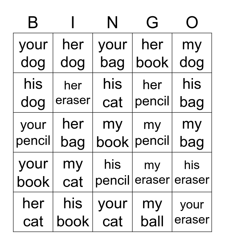 This bingo card has 25 words: my cat, your cat, his cat, her cat, my dog, your dog, his dog, her dog, my pencil, his pencil, her pencil, your pencil, my eraser, his eraser, her eraser, your eraser, my bag, your bag, his bag, her bag, my book, his book, your book, her book and my ball.
