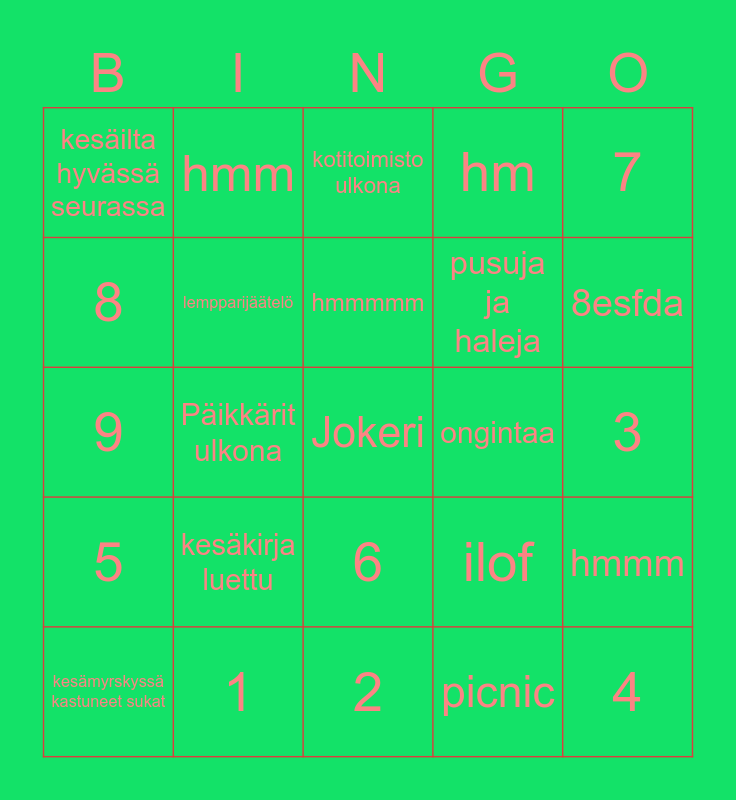 This bingo card has a free space and 29 words: kesämyrskyssä kastuneet sukat, lounas terassilla, Päikkärit ulkona, ulkotreenit, kesäilta hyvässä seurassa, kotitoimisto ulkona, lempparijäätelö, kesäkirja luettu, ongintaa, 1, 3, 4, 2, picnic, 8esfda, veneretki, 6, 5, 7, 9, ilof, dhhdhd, pusuja ja haleja, 8, hm, hmm, hmmm, hmmmmm and hmmmmm.