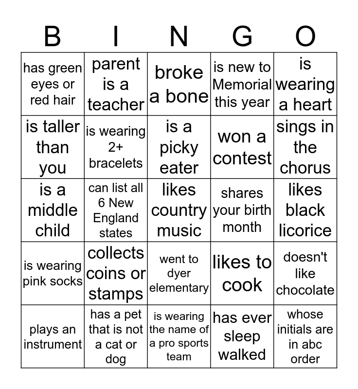 This bingo card has 76 words: FREE!, likes sushi, broke a bone, been to Canada, is afraid of spiders, speaks 2 languages, is left handed, plays Minecraft, bites fingernails, can name all 7 dwarves, whose initials are in abc order, took swimming lessons, is a picky eater, is taller than you, been to a wedding in the last year, can list all 6 New England states, has had stitches, likes country music, has two dogs, is wearing a heart, is good at drawing, is a middle child, is wearing 2+ bracelets, parent is a teacher, is new to Memorial this year, last name is more than 7 letters, favorite color is red, is on the track team, lives near train tracks, believes in ghosts, has used a lawn mower, is wearing boots, has painted toenails, likes to cook, sings in the chorus, won a contest, whose favorite season is Winter, wearing memorial clothing, likes black licorice, has ever sleep walked, is allergic to cats, has a grandparent living with them, has a cell phone in their pocket, Rides bus 9, knows how to play chess, did not eat breakfast today, plays an instrument, has green eyes or red hair, likes fishing, saw a movie this week, likes non-fiction, went to dyer elementary, exercised 4x this week, has worn braces, has a sibling at Memorial, has a chapstick or lip balm on them, has pierced ears, remembers last night's dream, is a "morning person", likes to dance, collects coins or stamps, plays baseball, was born in another country, forgot to brush teeth today, has no sisters or brothers, is good at math, shares your birth month, wearing shoes without laces, babysits for siblings, has met someone famous, doesn't like chocolate, is wearing pink socks, has a pet that is not a cat or dog, doesn't like bananas, is wearing the name of a pro sports team and walks to school.
