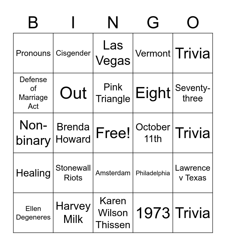This bingo card has a free space and 24 words: Stonewall Riots, Harvey Milk, Pink Triangle, Ellen Degeneres, Trivia, Pronouns, Defense of Marriage Act, Cisgender, October 11th, Amsterdam, Eight, Non-binary, Philadelphia, Lawrence v Texas, Out, 1973, Trivia, Las Vegas, Seventy-three, Brenda Howard, Trivia, Healing, Vermont and Karen Wilson Thissen.