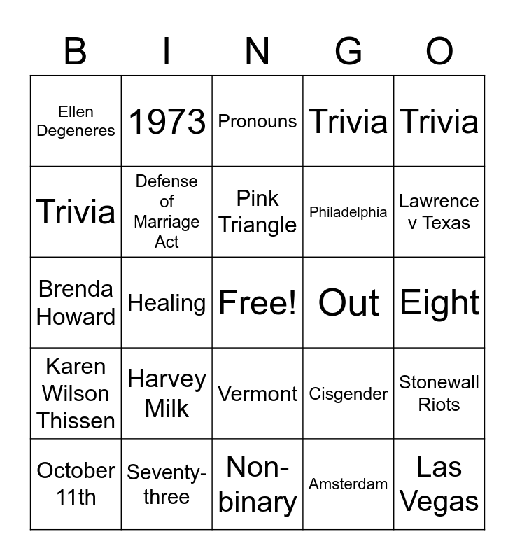 This bingo card has a free space and 24 words: Harvey Milk, Seventy-three, Pink Triangle, October 11th, Trivia, Ellen Degeneres, Trivia, 1973, Out, Vermont, Philadelphia, Brenda Howard, Cisgender, Stonewall Riots, Defense of Marriage Act, Amsterdam, Eight, Pronouns, Lawrence v Texas, Healing, Las Vegas, Karen Wilson Thissen, Trivia and Non-binary.