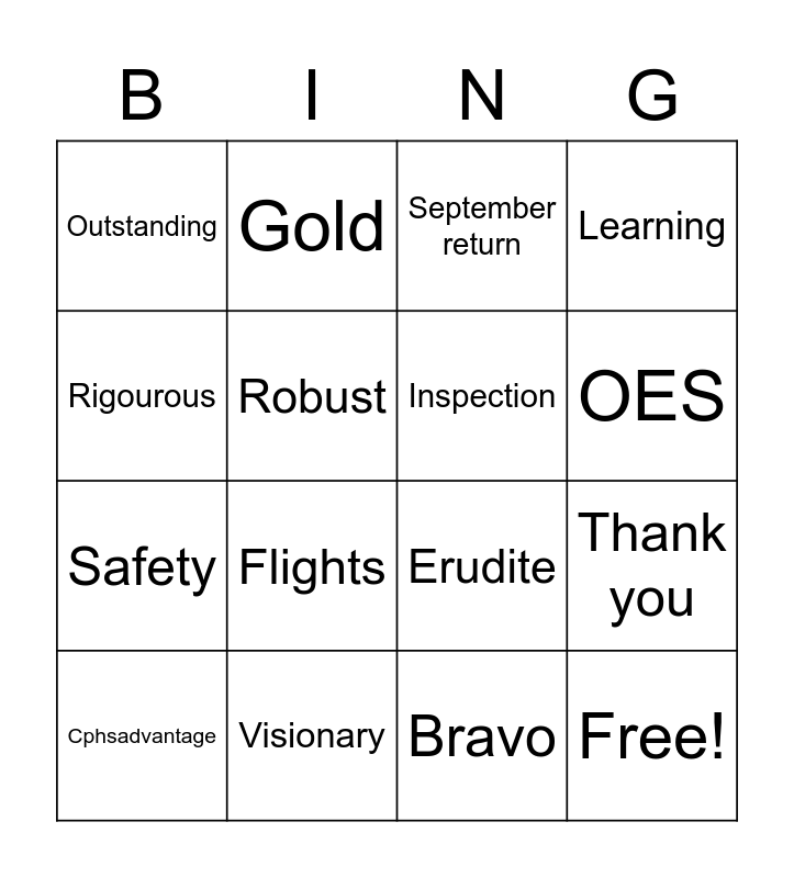 This bingo card has 23 words: Free!, Awards, OES, Excellent, Rigourous, Outstanding, Robust, Gold, Cphsadvantage, Journey, Flights, Safety, Positivity, Covid, Visionary, Mentions leaving staff, September return, Erudite, Inspection, Thank you, Learning, Bravo and Sincere.