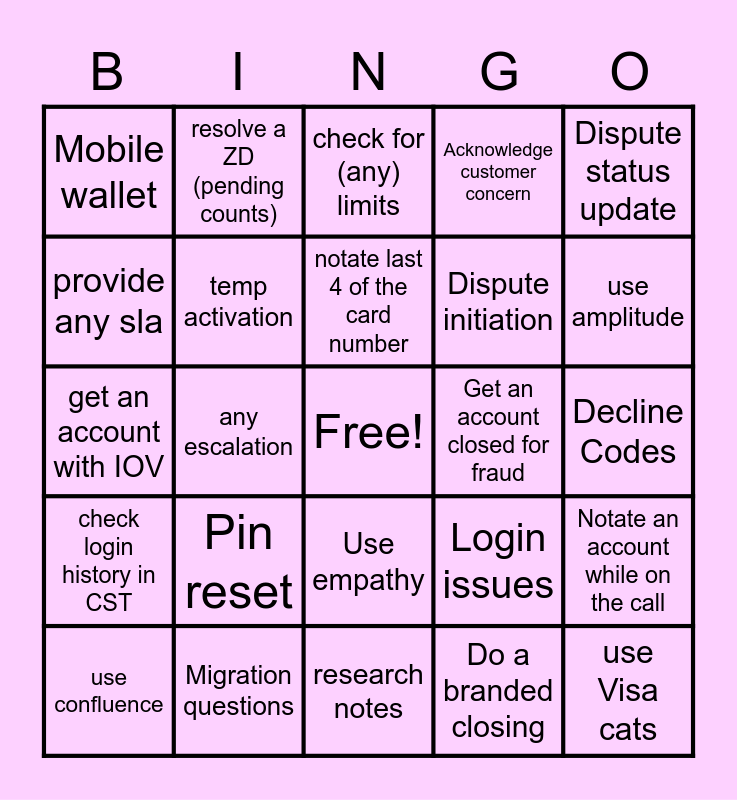 This bingo card has a free space and 24 words: Pin reset, Migration questions, notate last 4 of the card number, use confluence, Dispute status update, Mobile wallet, provide any sla, resolve a ZD (pending counts), Get an account closed for fraud, Use empathy, Dispute initiation, get an account with IOV, Login issues, Notate an account while on the call, temp activation, Do a branded closing, Decline Codes, check for (any) limits, use amplitude, any escalation, use Visa cats, check login history in CST, Acknowledge customer concern and research notes.