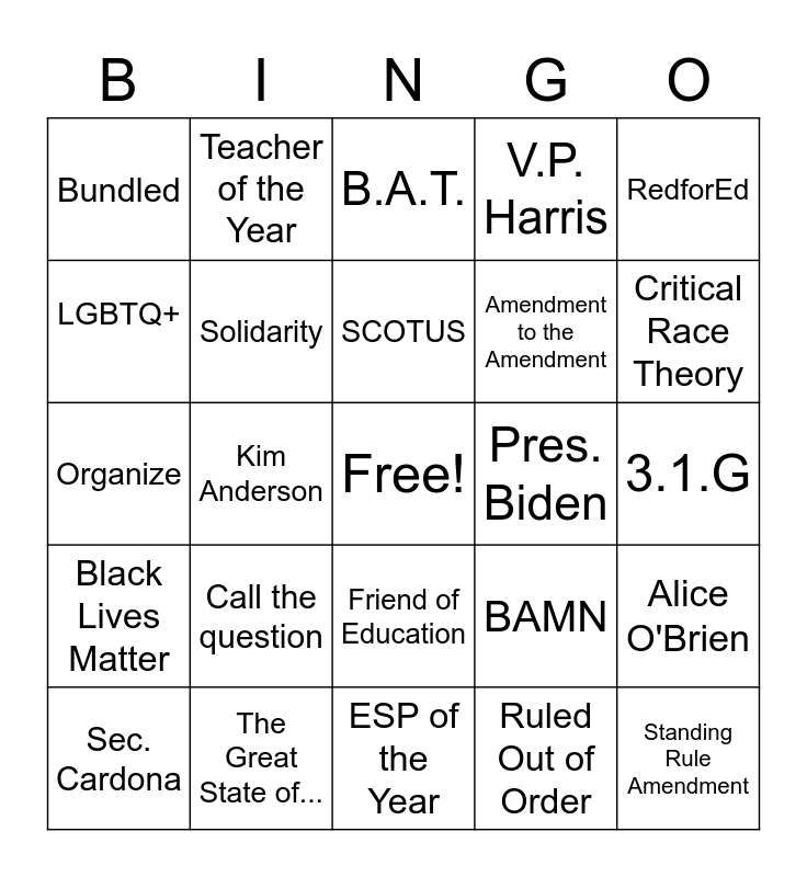 This bingo card has a free space and 24 words: Sec. Cardona, Call the question, SCOTUS, Ruled Out of Order, RedforEd, Bundled, Teacher of the Year, B.A.T., Pres. Biden, 3.1.G, Organize, Solidarity, BAMN, Alice O'Brien, LGBTQ+, The Great State of..., ESP of the Year, V.P. Harris, Critical Race Theory, Black Lives Matter, Kim Anderson, Friend of Education, Amendment to the Amendment and Standing Rule Amendment.