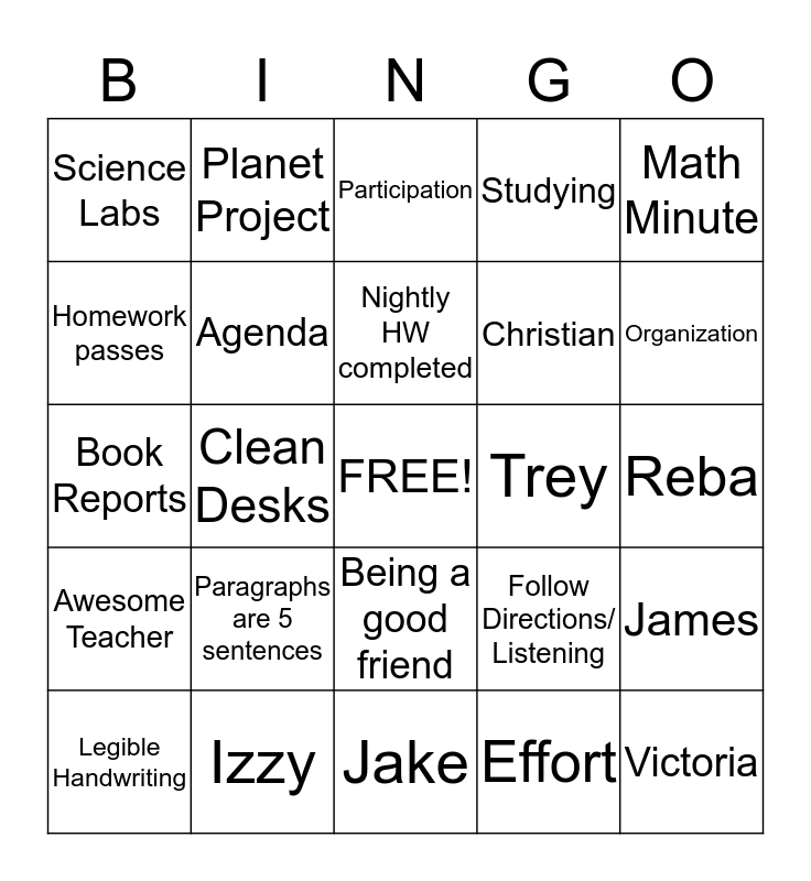 This bingo card has a free space and 24 words: Paragraphs are 5 sentences, Izzy, Nightly HW completed, Legible Handwriting, Math Minute, Science Labs, Homework passes, Planet Project, Trey, Being a good friend, Christian, Book Reports, Follow Directions/ Listening, James, Agenda, Effort, Reba, Participation, Organization, Clean Desks, Victoria, Awesome Teacher, Studying and Jake.