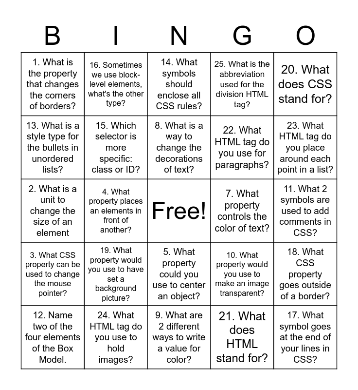 This bingo card has a free space and 25 words: 19. What property would you use to have set a background picture?, 9. What are 2 different ways to write a value for color?, 8. What is a way to change the decorations of text?, 12. Name two of the four elements of the Box Model., 20. What does CSS stand for?, 1. What is the property that changes the corners of borders?, 13. What is a style type for the bullets in unordered lists?, 16. Sometimes we use block-level elements, what's the other type?, 7. What property controls the color of text?, 5. What property could you use to center an object?, 22. What HTML tag do you use for paragraphs?, 2. What is a unit to change the size of an element, 10. What property would you use to make an image transparent?, 18. What CSS property goes outside of a border?, 15. Which selector is more specific: class or ID?, 6. What are 5 CSS Colors, 11. What 2 symbols are used to add comments in CSS?, 14. What symbols should enclose all CSS rules?, 23. What HTML tag do you place around each point in a list?, 4. What property places an elements in front of another?, 17. What symbol goes at the end of your lines in CSS?, 24. What HTML tag do you use to hold images?, 3. What CSS property can be used to change the mouse pointer?, 25. What is the abbreviation used for the division HTML tag? and 21. What does HTML stand for?.