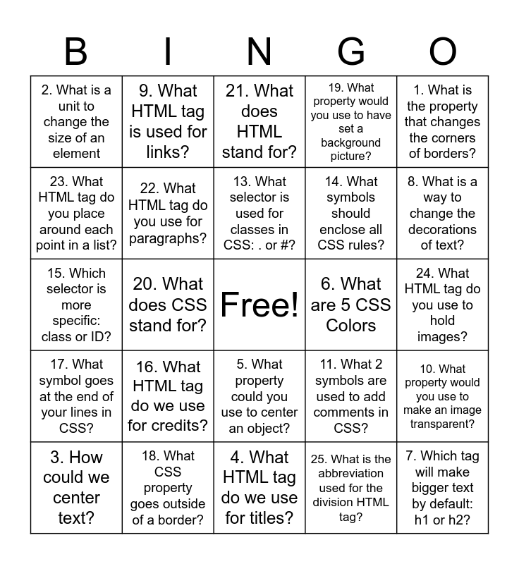 This bingo card has a free space and 25 words: 16. What HTML tag do we use for credits?, 4. What HTML tag do we use for titles?, 13. What selector is used for classes in CSS: . or #?, 3. How could we center text?, 1. What is the property that changes the corners of borders?, 2. What is a unit to change the size of an element, 23. What HTML tag do you place around each point in a list?, 9. What HTML tag is used for links?, 6. What are 5 CSS Colors, 5. What property could you use to center an object?, 14. What symbols should enclose all CSS rules?, 15. Which selector is more specific: class or ID?, 11. What 2 symbols are used to add comments in CSS?, 10. What property would you use to make an image transparent?, 22. What HTML tag do you use for paragraphs?, 12. Name two of the four elements of the Box Model., 24. What HTML tag do you use to hold images?, 21. What does HTML stand for?, 8. What is a way to change the decorations of text?, 20. What does CSS stand for?, 7. Which tag will make bigger text by default: h1 or h2?, 18. What CSS property goes outside of a border?, 17. What symbol goes at the end of your lines in CSS?, 19. What property would you use to have set a background picture? and 25. What is the abbreviation used for the division HTML tag?.