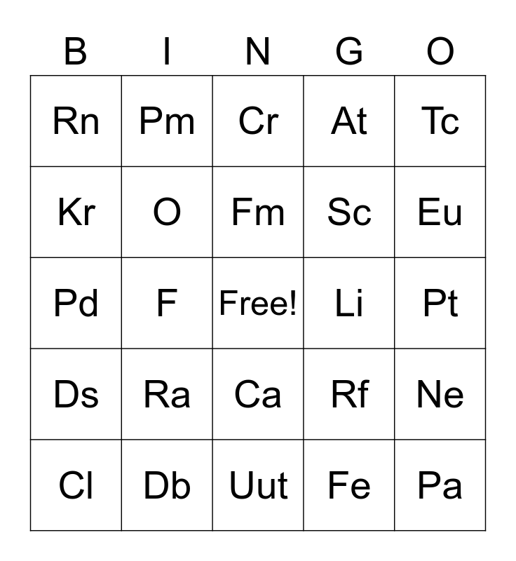 This bingo card has a free space and 118 words: Ac, Al, Am, Sb, Ar, As, At, Ba, Bk, Be, Bi, Bh, B, Br, Cd, Cs, Ca, Cf, C, Ce, Cl, Cr, Co, Cu, Cm, Ds, Db, Dy, Es, Er, Eu, Fm, F, Fr, Gd, Ga, Ge, Au, Hf, Hs, He, Ho, H, In, I, Ir, Fe, Kr, La, Lr, Pb, Li, Lu, Mg, Mn, Mt, Md, Hg, Mo, Nd, Ne, Np, Ni, Nb, N, No, Os, O, Pd, P, Pt, Pu, Po, K, Pr, Pm, Pa, Ra, Rn, Re, Rh, Rg, Rb, Ru, Rf, Sm, Sc, Sg, Se, Si, Ag, Na, Sr, S, Ta, Tc, Te, Tb, Tl, Th, Tm, Sn, Ti, W, Uub, Uuh, Uuo, Uup, Uuq, Uus, Uut, U, V, Xe, Yb, Y, Zn and Zr.