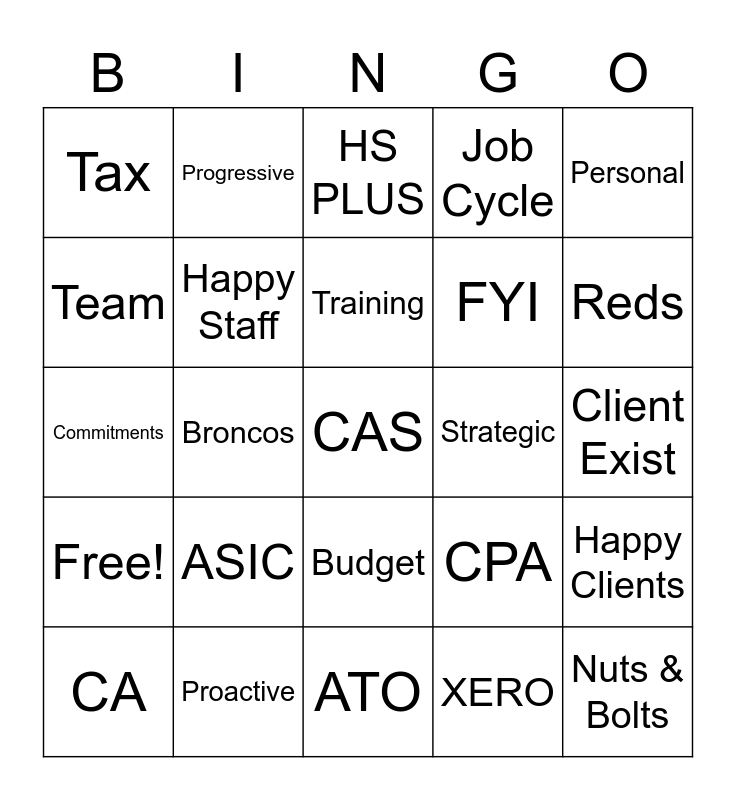 This bingo card has 25 words: Free!, Proactive, CAS, XERO, Personal, Tax, Progressive, HS PLUS, Strategic, Happy Clients, Team, Happy Staff, ATO, CPA, Reds, CA, Broncos, Training, FYI, Client Exist, Commitments, ASIC, Budget, Job Cycle and Nuts & Bolts.